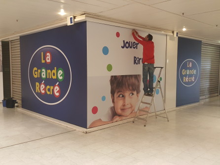 Habillage de l’escalier à La Grande Récré Daumesnil et d’une vitrine à La Grande Récré Rive Gauche (Montparnasse)